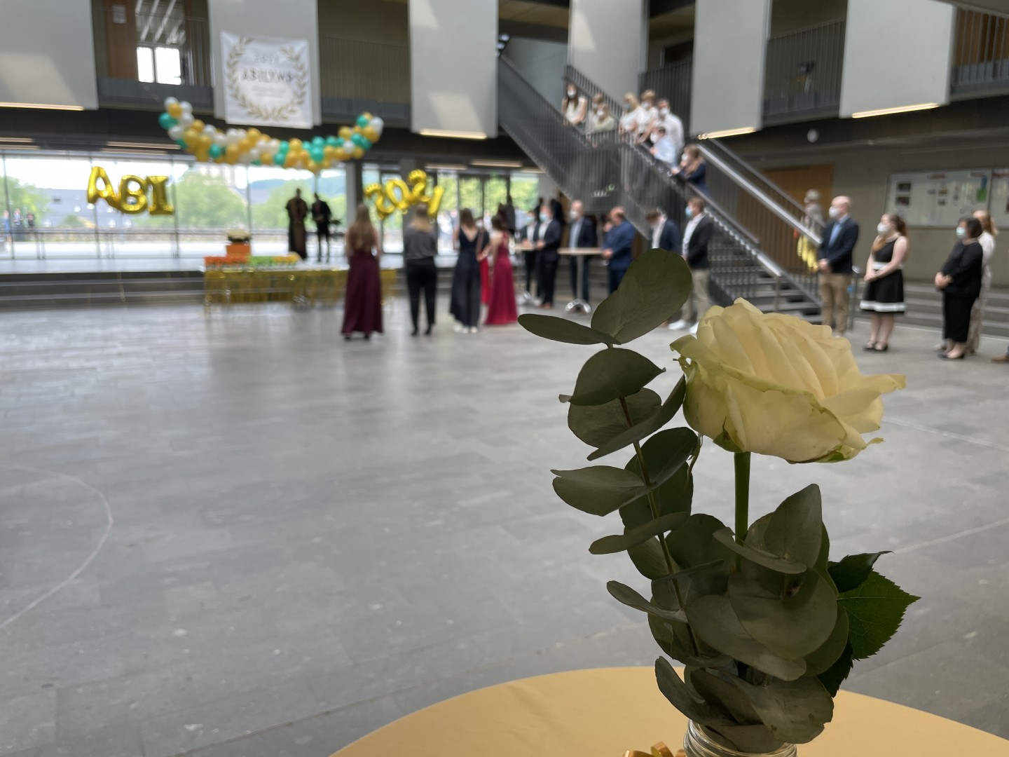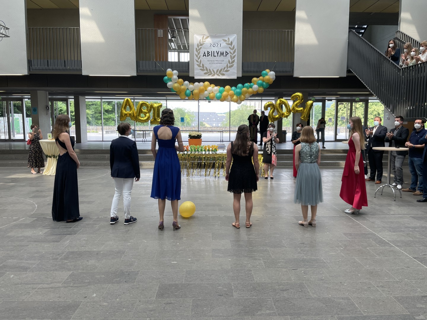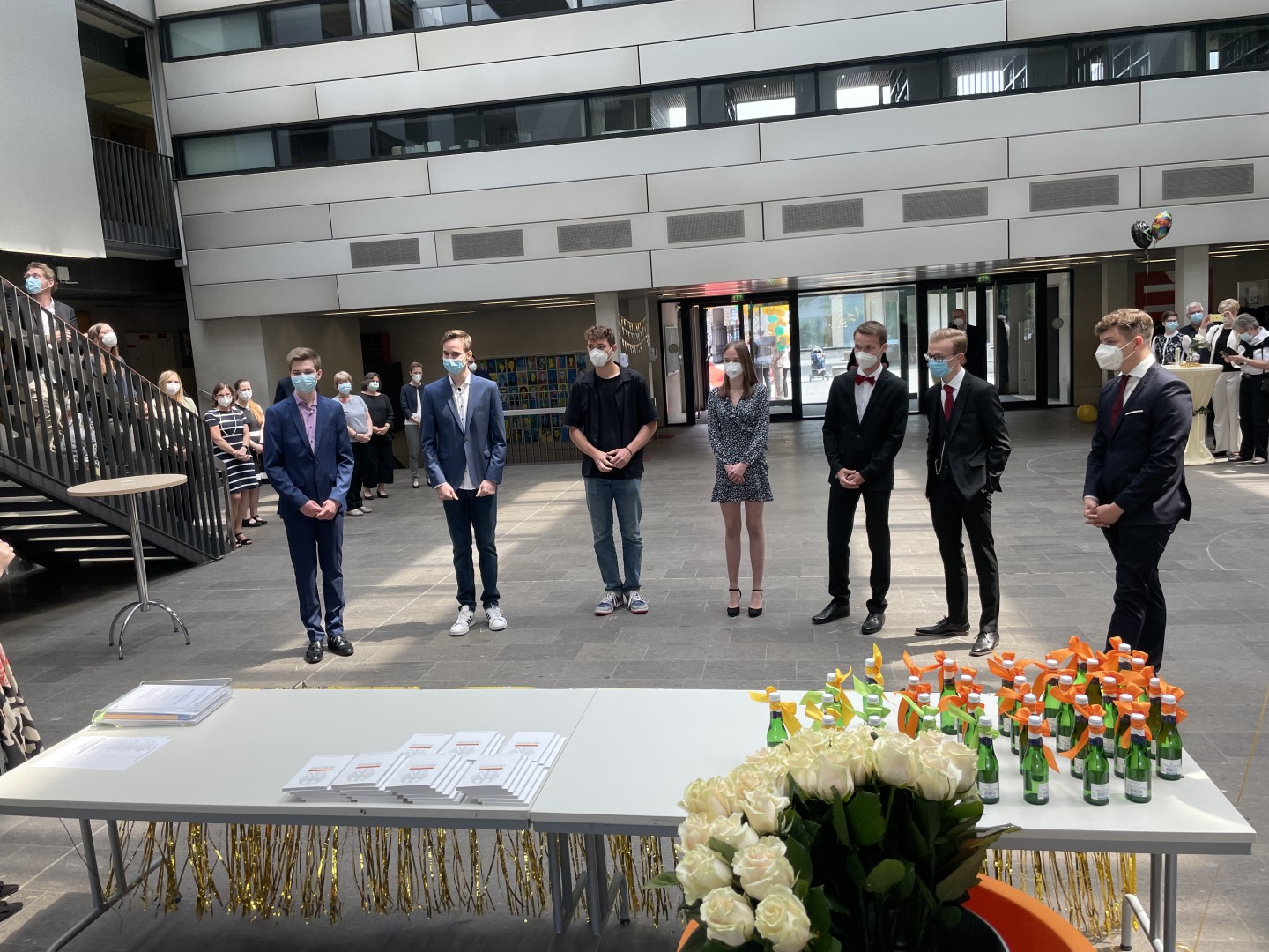 Wie im letzten Jahr wurde auch die Zeugnisvergabe der Abiturientia 2021 in einem Pandemie-konformen Format im Forum unserer Schule abgehalten. In Kleingruppen erhielten die Abiturientinnen und Abiturienten im festlich geschmückten Forum ihre Zeugnisse und wurden mit reichlich Applaus ihrer Familien sowie des gesamten Kollegiums empfangen und begleitet. Diese herzliche Anerkennung haben sie sich auch redlich verdient - nach einem Corona-Jahr voll von besonderen Herausforderungen.