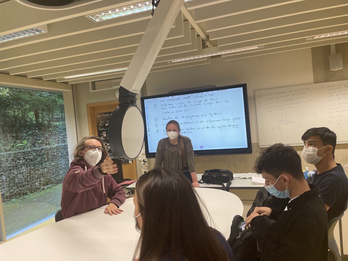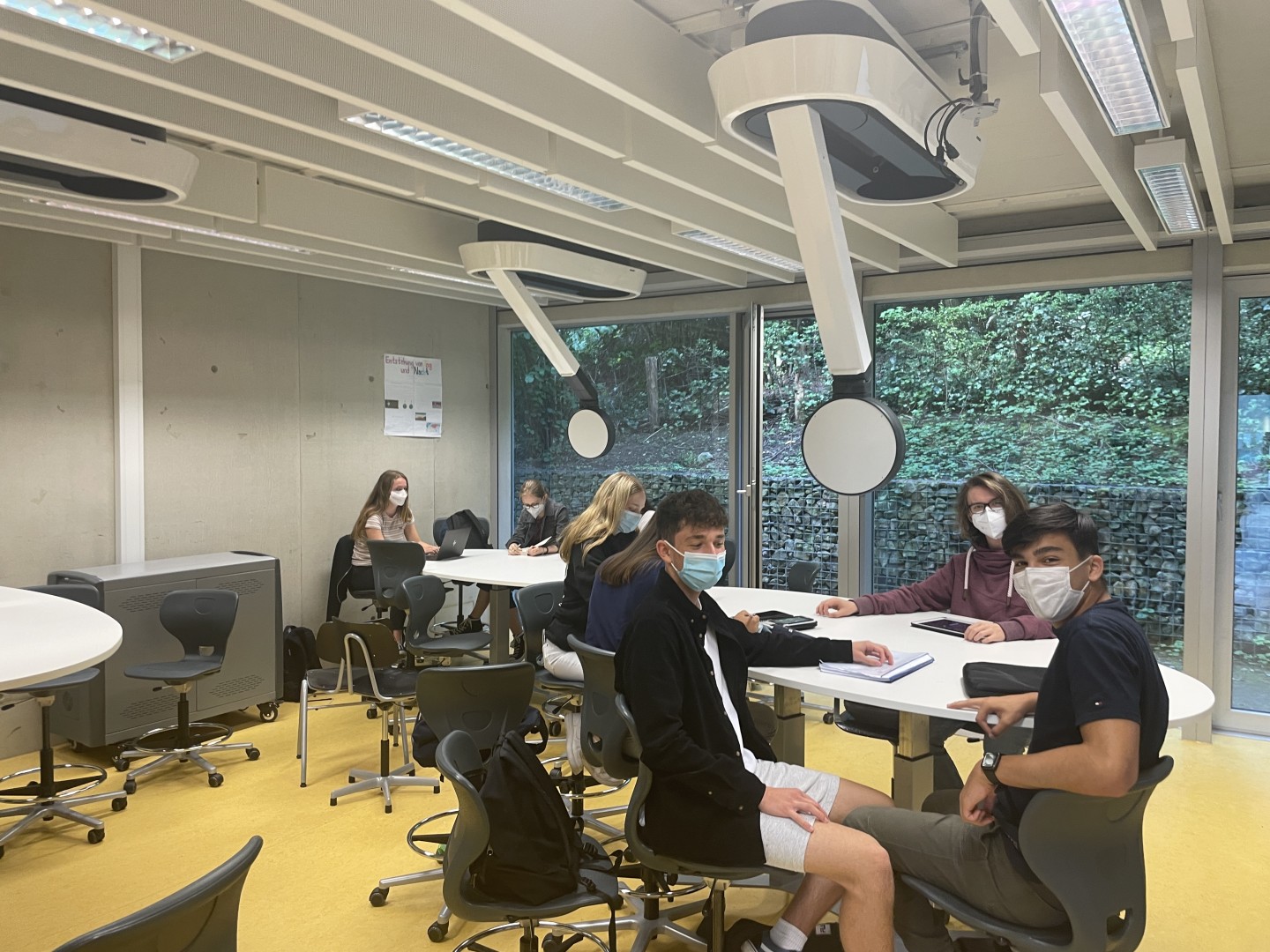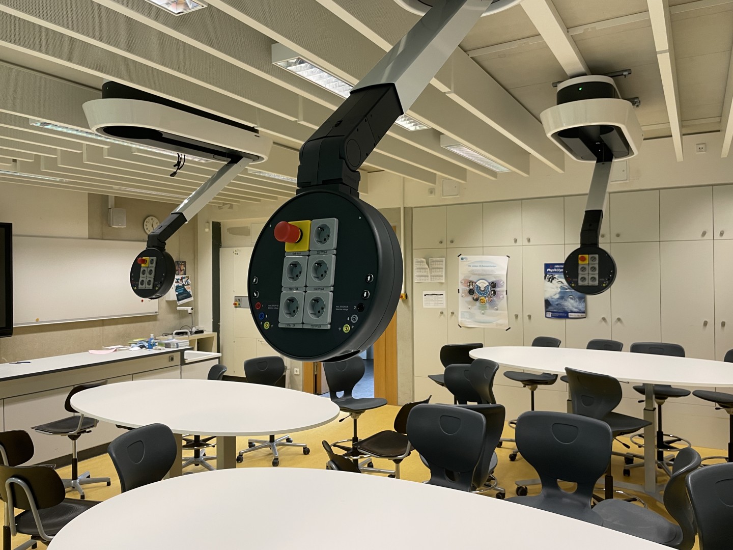 Es ist aber nicht allen die moderne technische Ausstattung, die diesen Raum - oder "Raumschiff" wie ihn die Physik-Fachschaft liebevoll nennt - so besonders macht, sondern auch die Möglichkeiten zur Teamarbeit. Denn anstatt der üblichen Sitz- oder Tischreihen gibt es für die Klassen und Kurse lediglich drei geräumige Gruppentische, die zudem höhenverstellbar und mit ergonomischen Arbeitsstühlen ausgestattet sind.