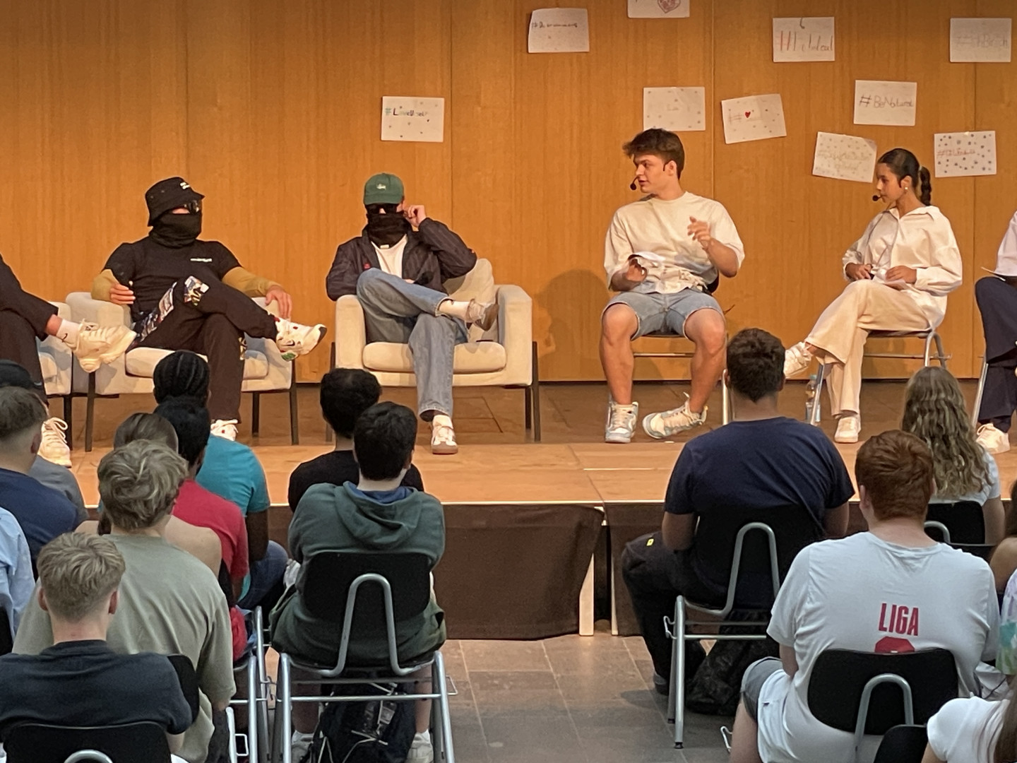Das hat es so am MGW auch noch nicht gegeben: Drei coole maskierte Typen mit Sonnenbrillen und Mützen nahmen auf der Bühne im vollbesetzten Forum Platz und standen fast 90 Minuten den Fragen der SV sowie den anwesenden SchülerInnen und LehrerInnen Rede und Antwort.