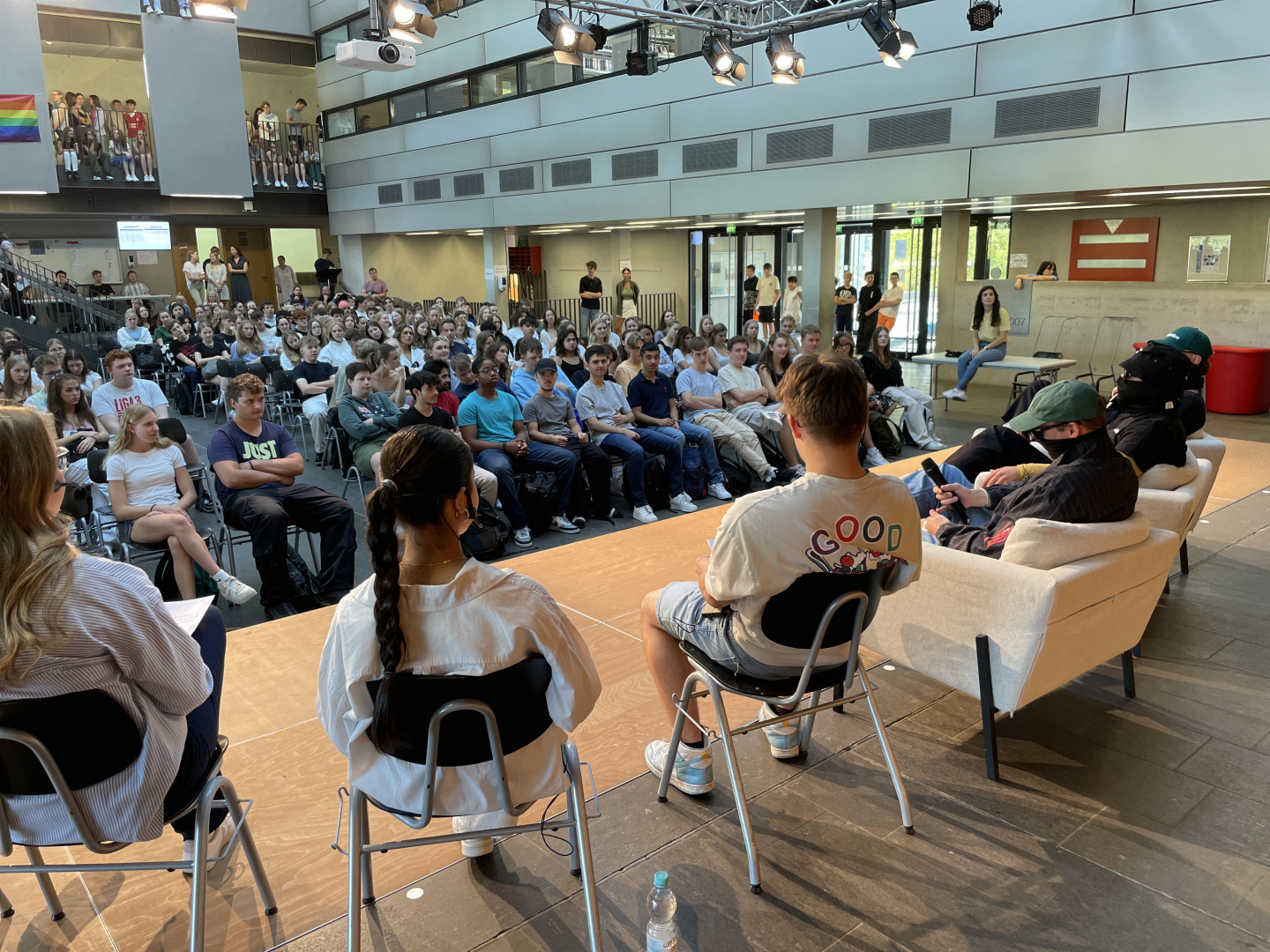 Eigentlich sollten nur die Schülerinnen und Schüler der Oberstufe an diesem Talk, der vorbereitet und moderiert wurde von dem SV-SprecherInnen-Team, teilnehmen, aber das Interesse war so groß, dass auch in den oberen Etagen noch Schülerinnen und Schüler der Mittelstufe dem Gespräch zuhörten. Nach einer kurzen Vorstellung konzentrierten sich die Fragen zunächst auf das von essen diese wiederholt aufgezeigte und problematisierte Nord-Süd-Gefälle in Essen. Schnell war allen klar, welche Privilegien und Vorzüge einhergehen mit dem Aufwachsen in Stadtteilen des Essener Südens, wobei sich auch eine offene und differenziert geführte Diskussion im Plenum ergab, wie man denn mit solchen Privilegien umgeht und wie auch der Umgang mit- und untereinander an unserer Schule sein sollte. Da das MGW als sog. Bündelungsschule als eines von nur wenigen Essener Gymnasien die Stufe EF anbietet, sind etliche Schülerinnen und Schüler von Essener Realschulen zu uns gekommen, die neu an einer Schule im Essener Süden angefangen haben und ihre Perspektive in das Gespräch heute einbringen konnten. Ein Schüler sprach offen darüber, auch an unserer Schule vereinzelt so etwas wie „Hochnäsigkeit" gegenüber den „Neuen" erfahren zu haben, appellierte aber an Werte wie Toleranz, Zusammenhalt und Wertschätzung, da doch alle ein gemeinsames Ziel hätten. Dieser Standpunkt stieß auf sehr viel Zuspruch und Applaus.