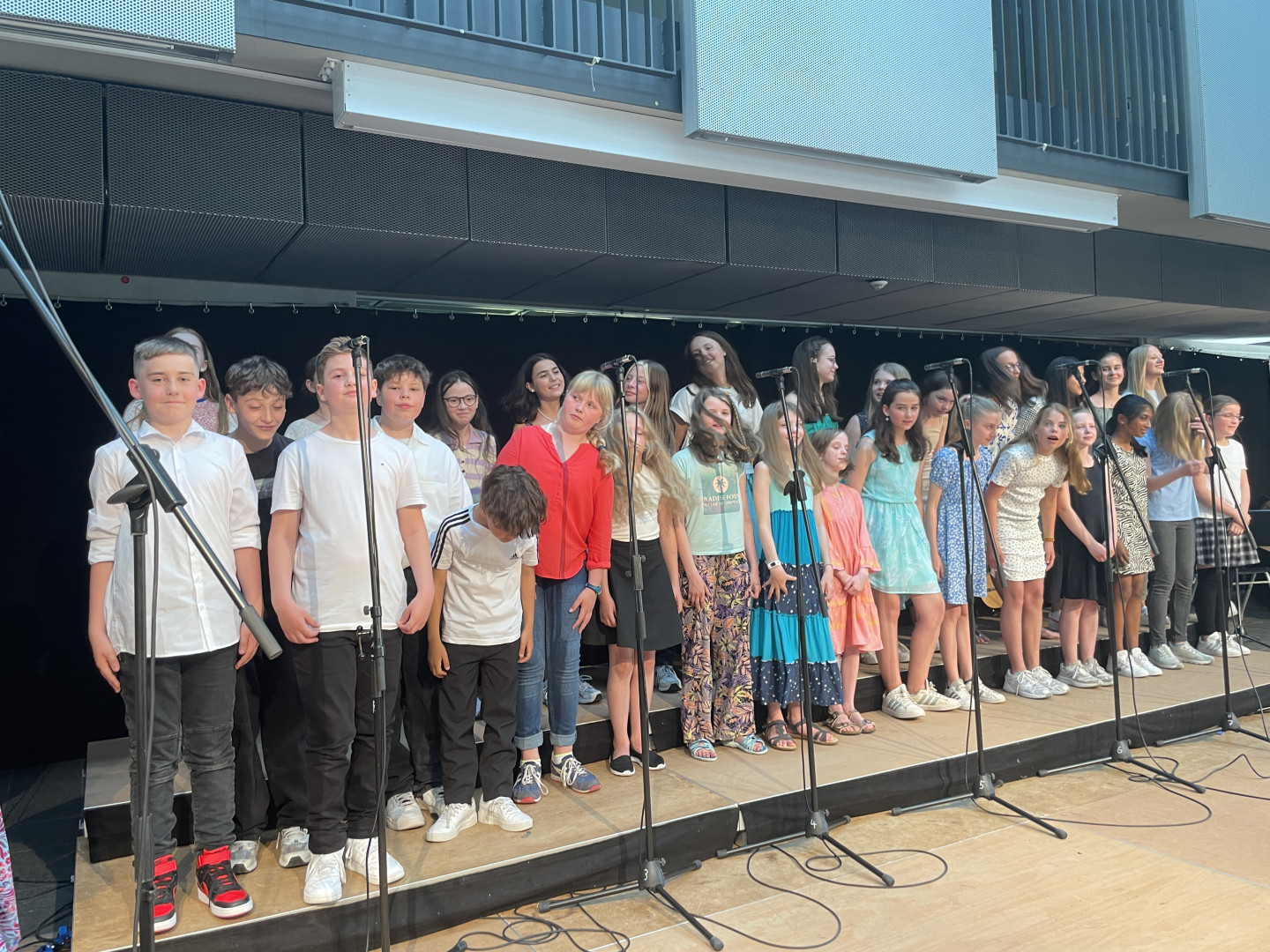 Beim großen Finale zum Pink-Hit „I never gonna not dance again" waren gleich mehrere unserer Ensembles auf der Bühne - der Unter- und Oberstufenchor, die Lehrerband sowie die Bigband. Abgerundet wurde die Nummer mit vielen Schülerinnen der 6. Klasse, die choreographisch eingeübt tanzten und auf der Empore mit Rollschuhen und einem Einkaufswagen für zusätzliche Stimmung sorgten - genau wie in dem Musikvideo zu dem Song.