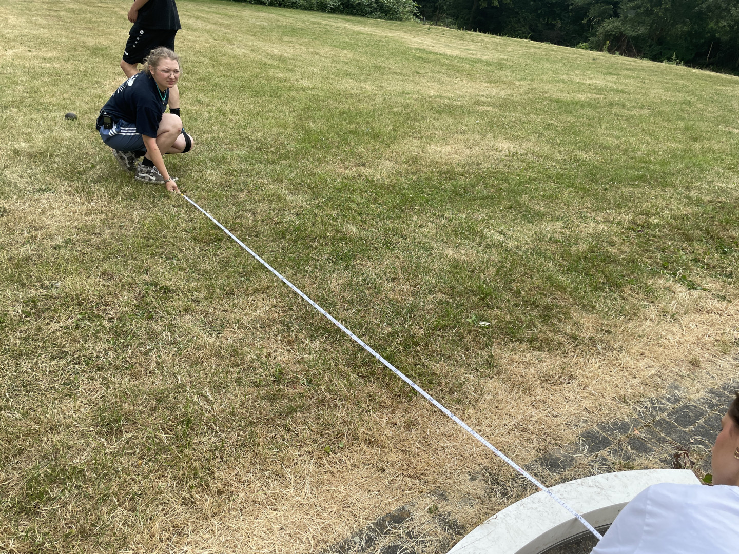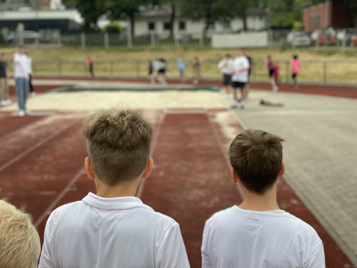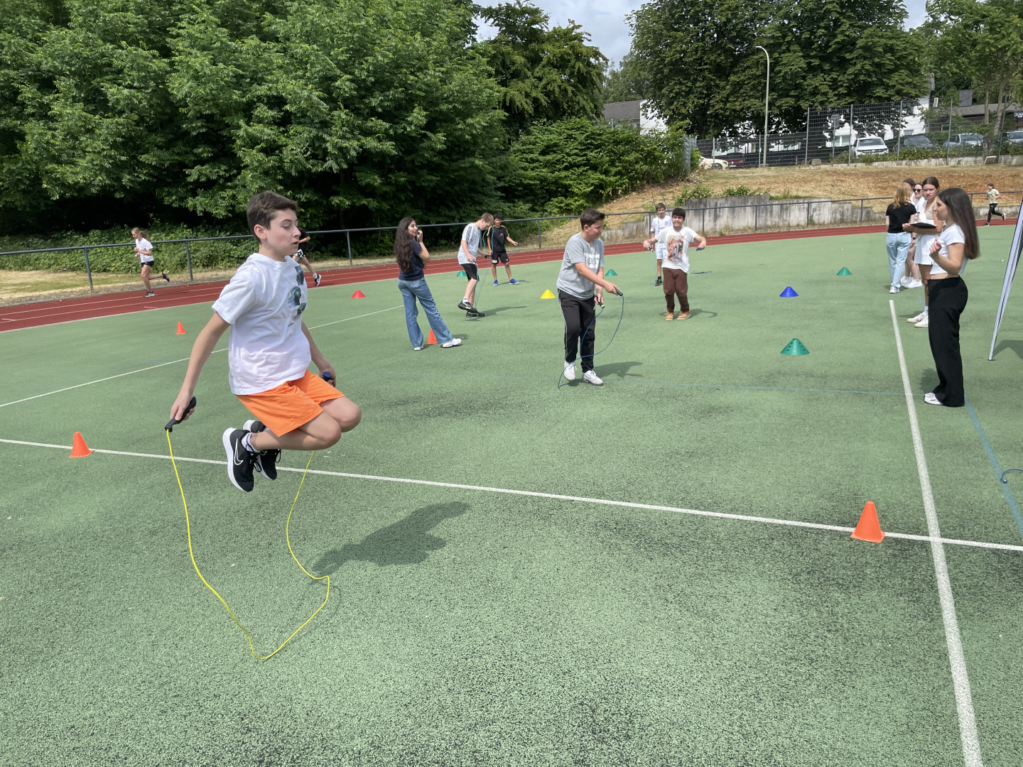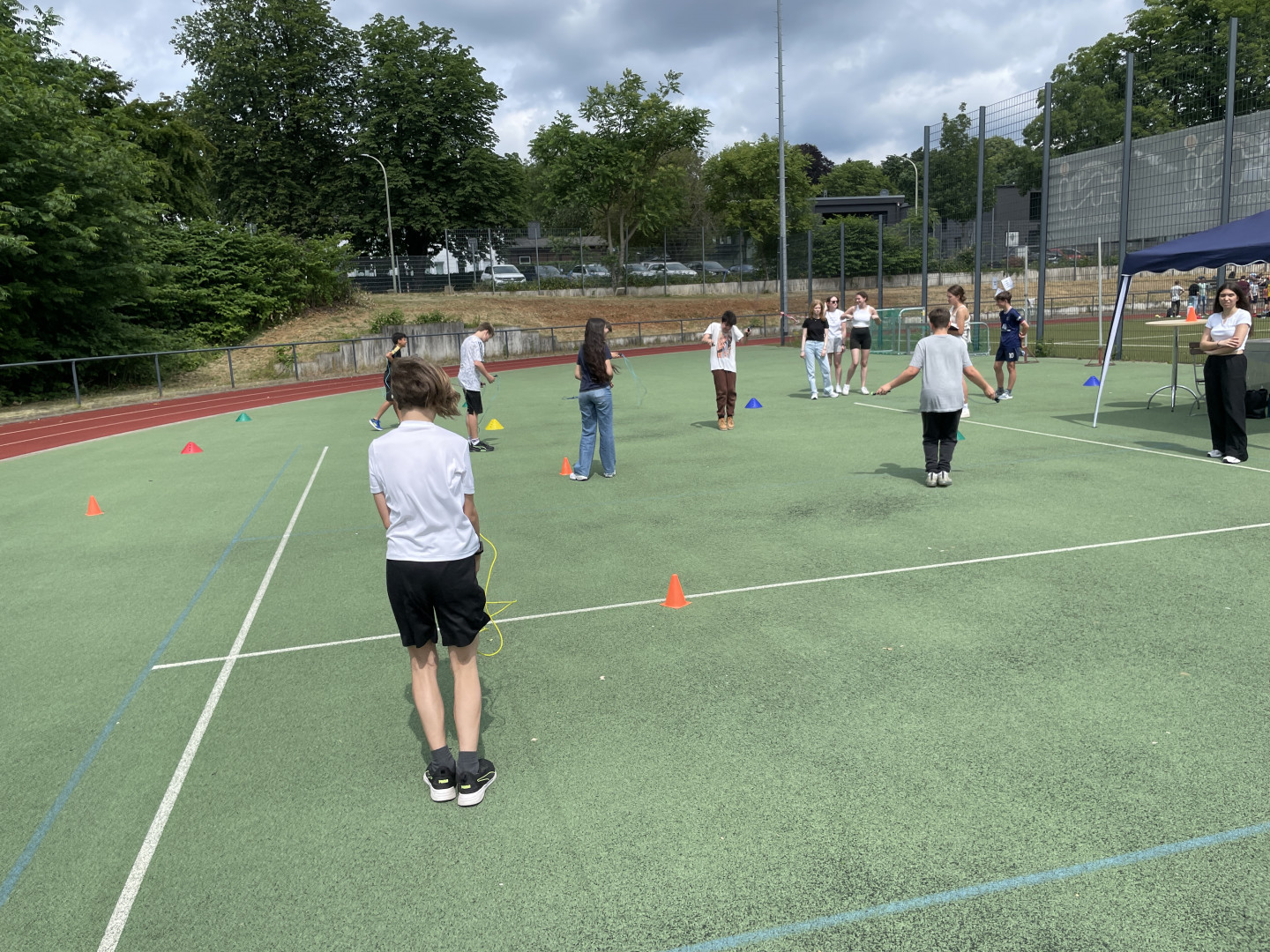 Am 19. Juni 2023 fand endlich wieder unserer jährliches Sportfest statt. Da dies die letzten drei Jahre ausgefallen ist, konnte man schnell den Eindruck gewinnen, dass die Sportfachschaft mal wieder „alles rausgeholt" hat, denn die Schülerinnen und Schüler konnten in insgesamt 7 Disziplinen herausgefordert werden wie etwa im Weitsprung, im Standweitsprung, im Weitwurf und im Kugelstoßen, in den Laufdisziplinen 800m und Sprint sowie im Seilspringen.